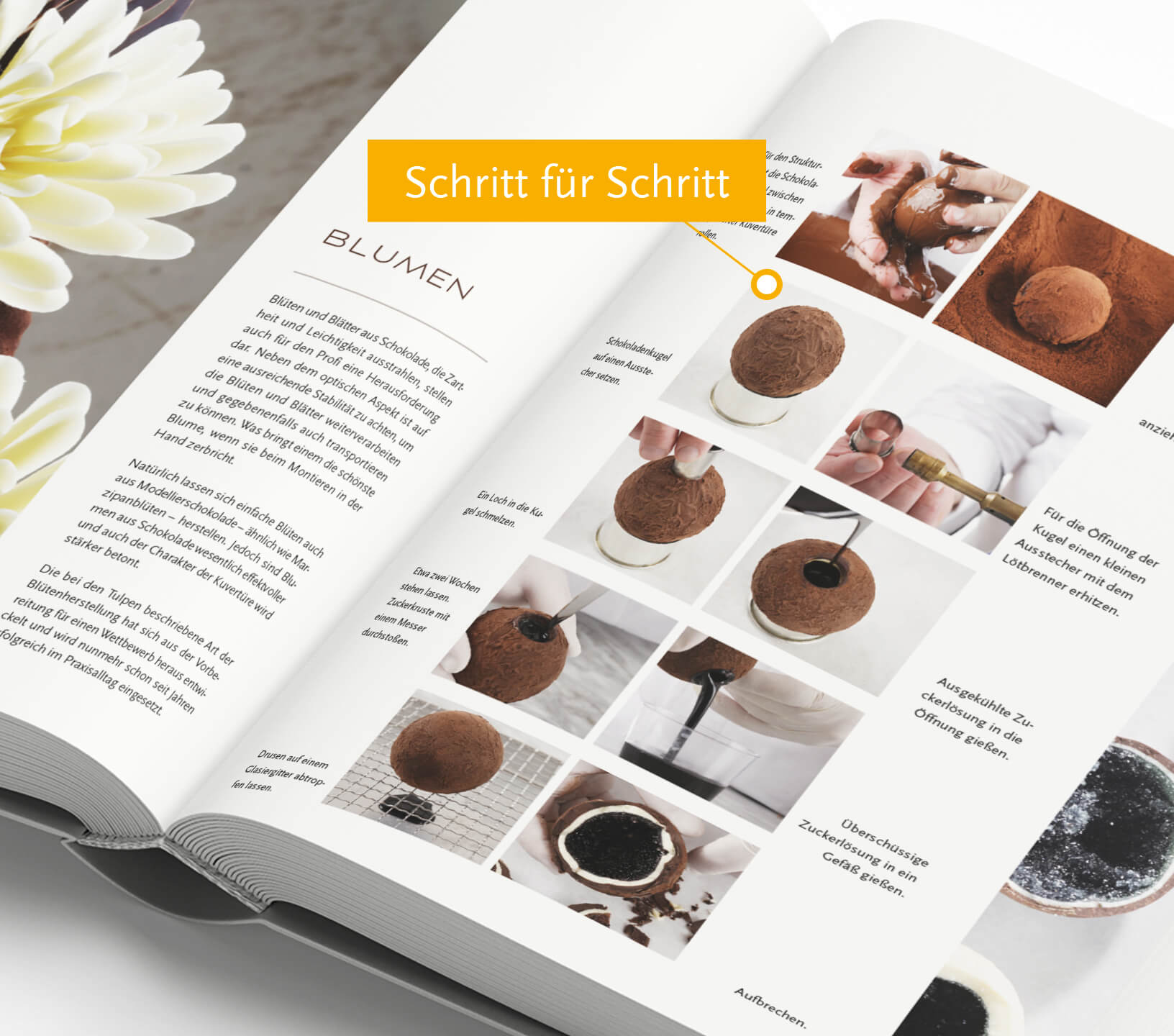Zahlreiche Fotos veranschaulichen Schritt für Schritt die Herstellung diverser Dekorelemente, sei es eine Masche aus Seidenzucker, eine Blüte aus Marzipan oder zarte Schwünge aus Schokolade. Und wo Fotos alleine nicht reichen, verhelfen Filme zu mehr Klarheit.