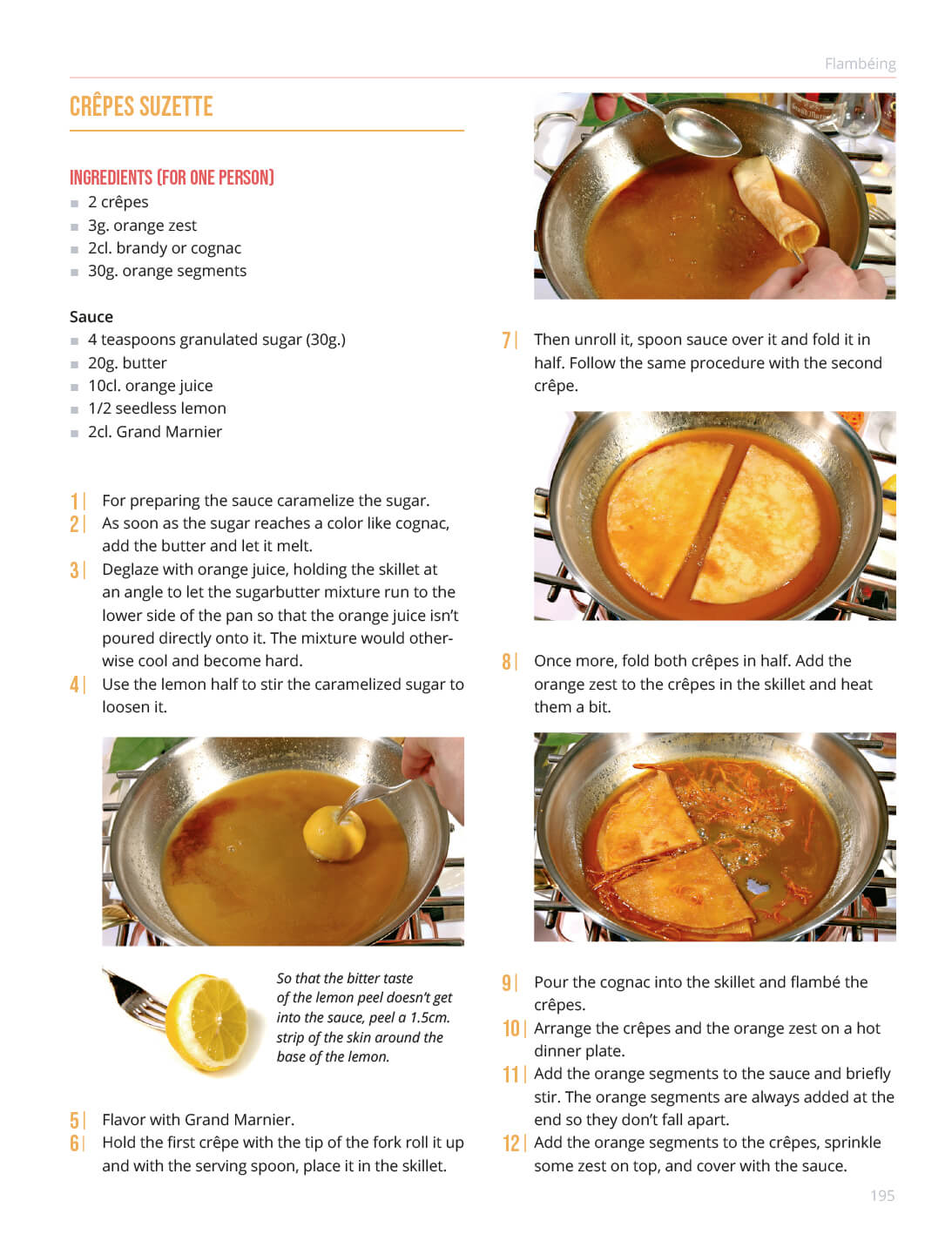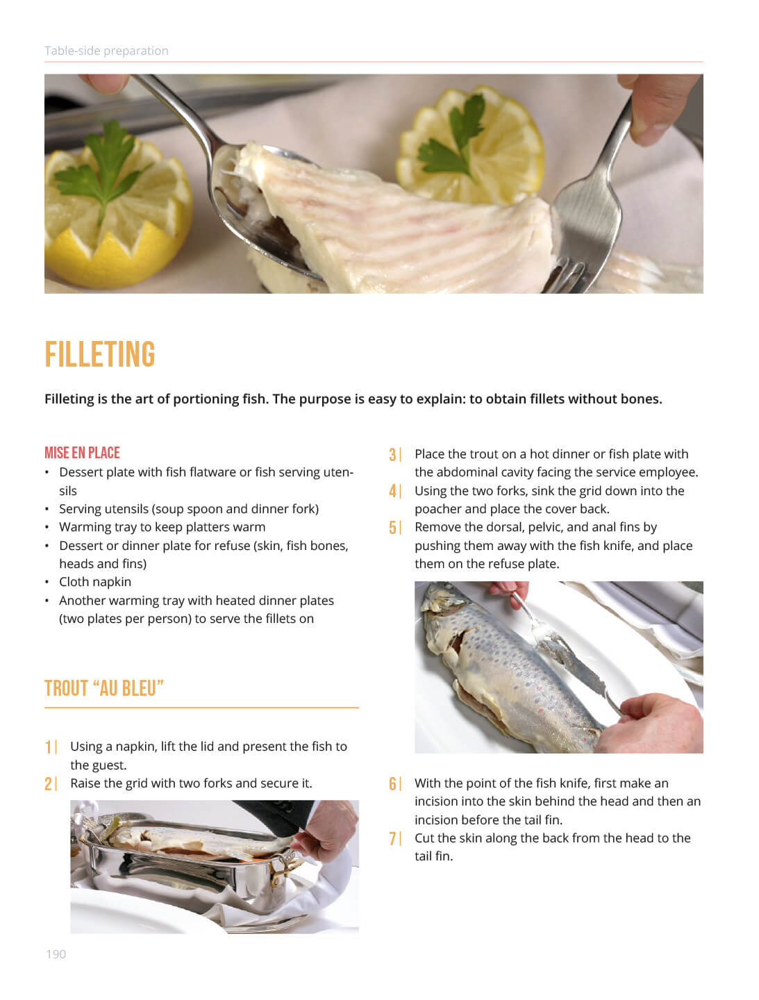Tranchieren, Filetieren, Flambieren, Marinieren werden anhand von gängigen Beispielen vorgestellt.