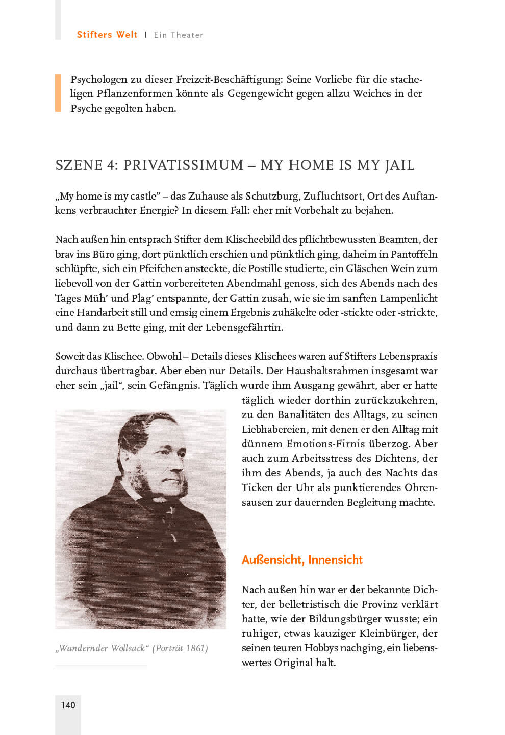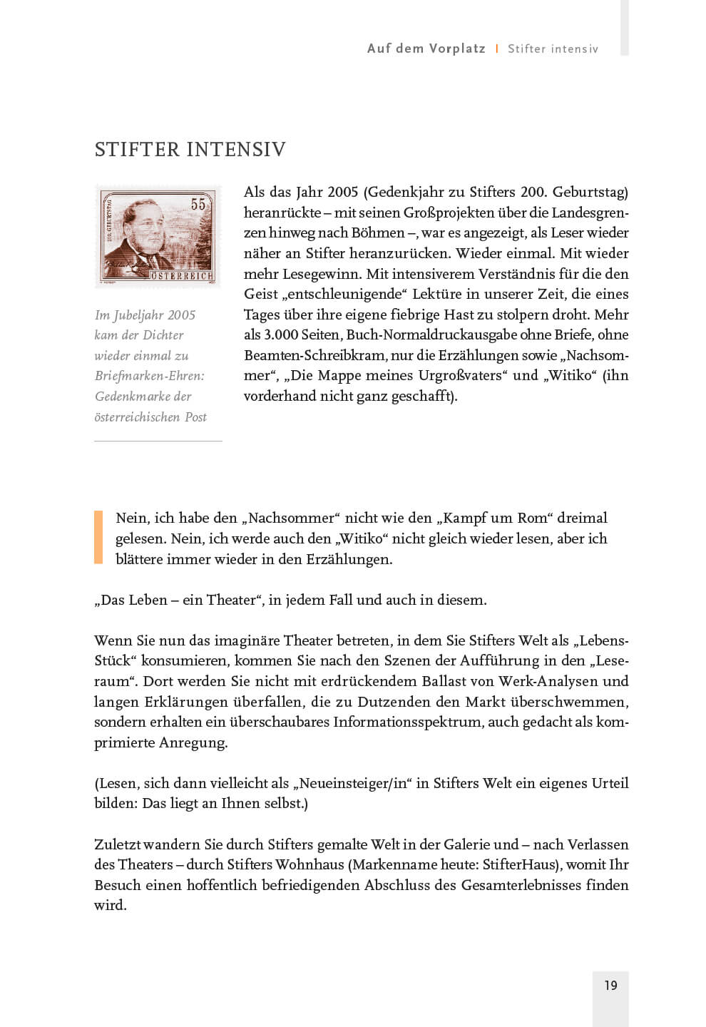 Eine in Konzept und Durchführung neuartige Annäherung an den Dichter, Pädagogen und Maler Adalbert Stifter. Hier agiert er als Hauptdarsteller im Zentrum eines szenisch gebauten Netzwerks von (Zeit-)Geschichte, Gesellschaft, Politik, Kultur, persönlichem Umfeld, Berufs- und Geistesleben – ein vielgestaltiges Panorama.