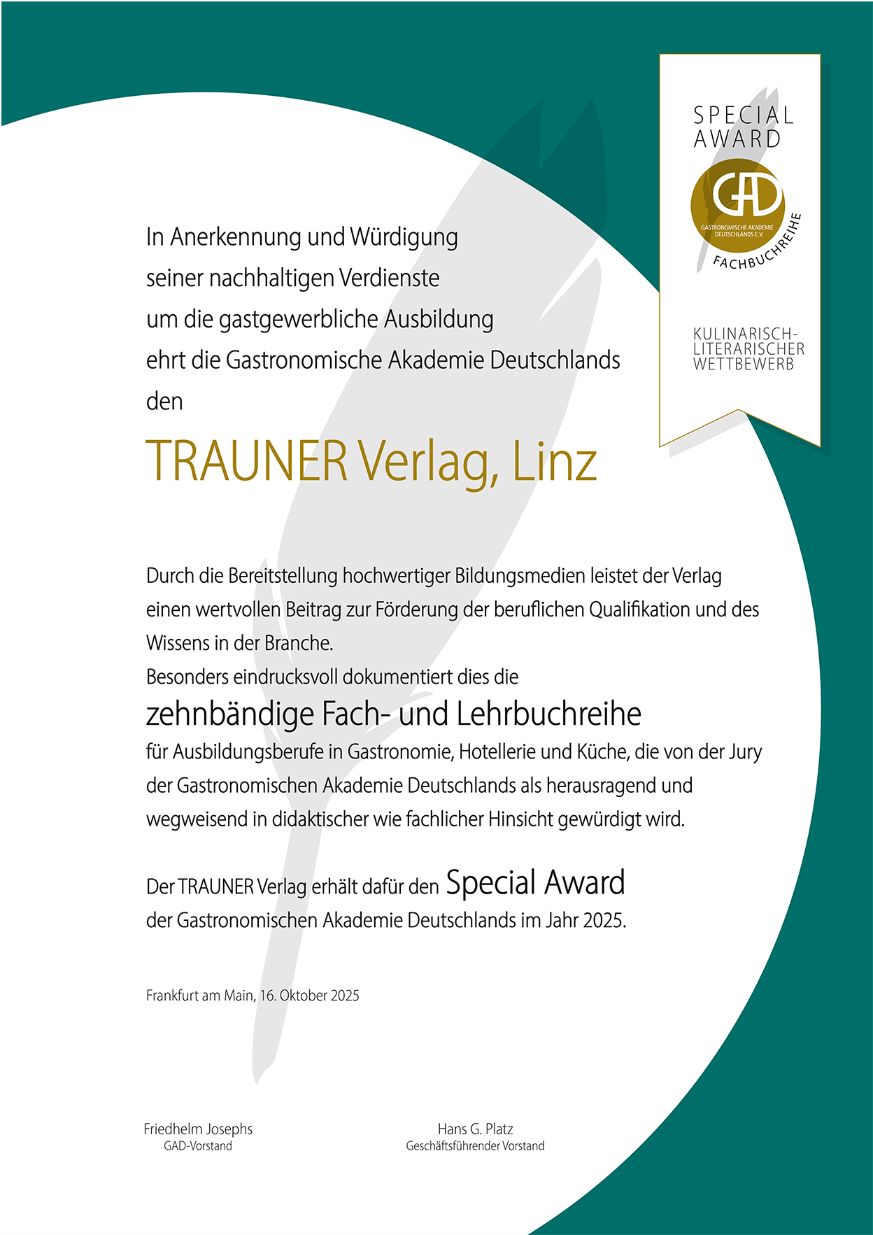 In Anerkennung und Würdigung seiner nachhaltigen Verdienste um die gastgewerbliche Ausbildung ehrt die Gastronomische Akademie Deutschlands den TRAUNER Verlag, Linz.