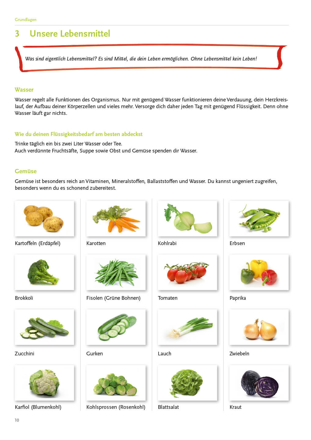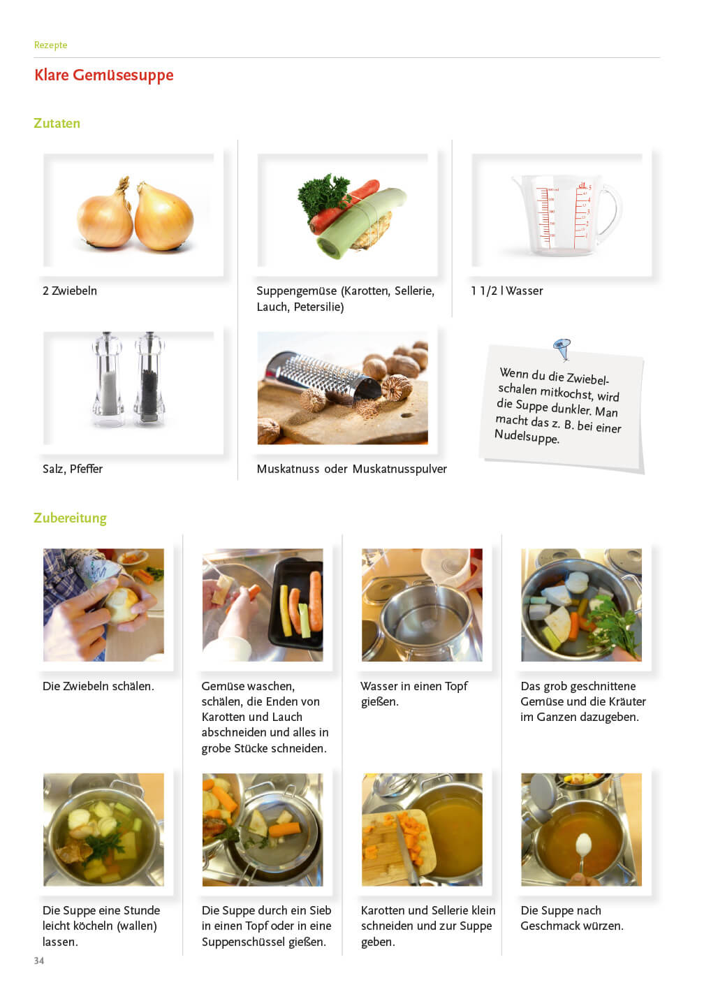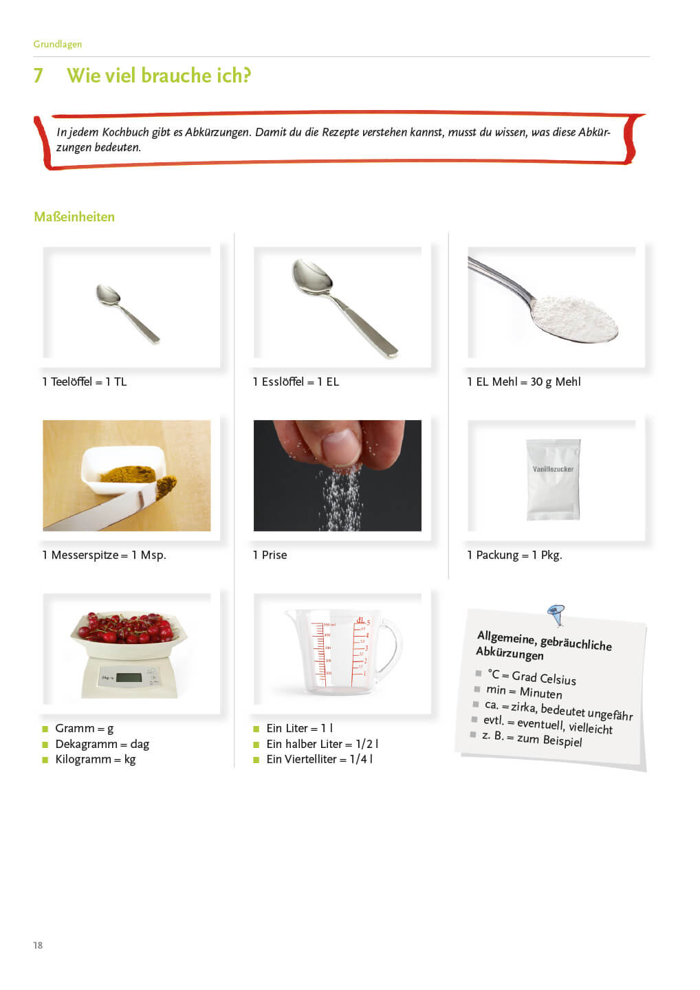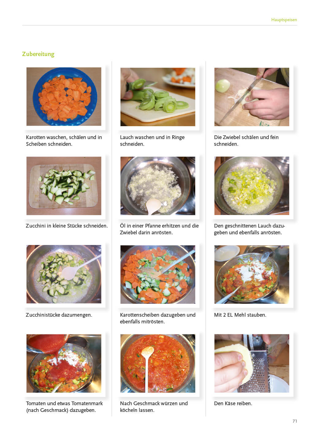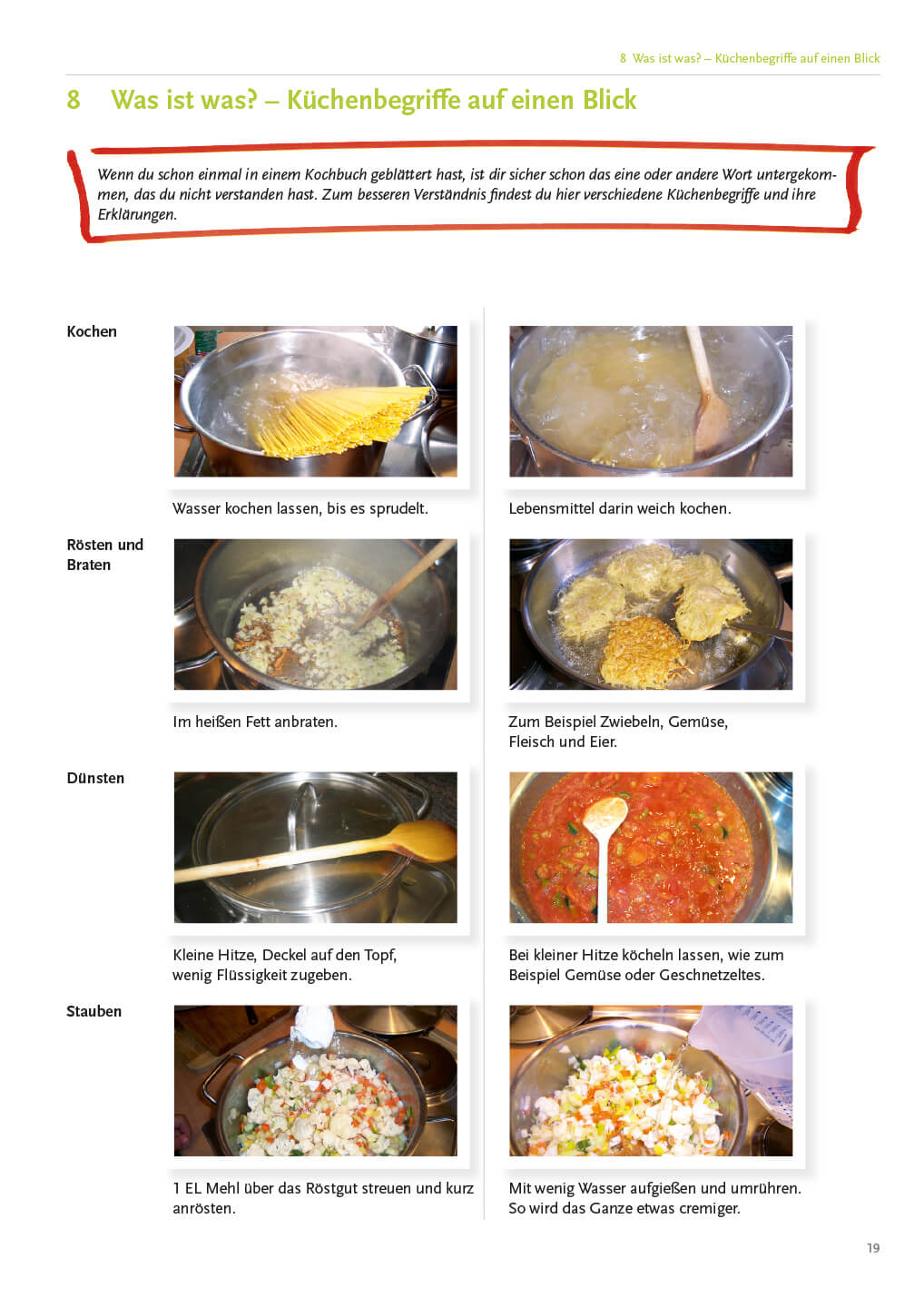 Gängige Küchenbegriffe wie dünsten oder stauben sind zu Beginn – selbstverständlich mit Fotos – schlicht und verständlich erklärt, ebenso wie die Vorbereitung von Lebensmitteln, das Tischdecken und die Hygiene