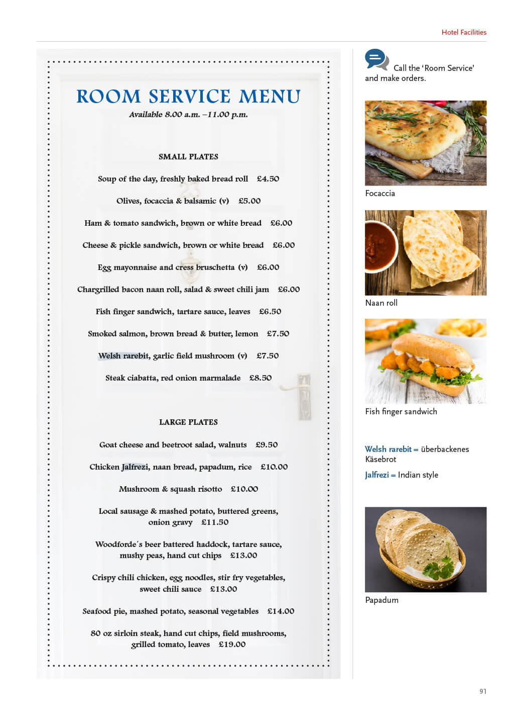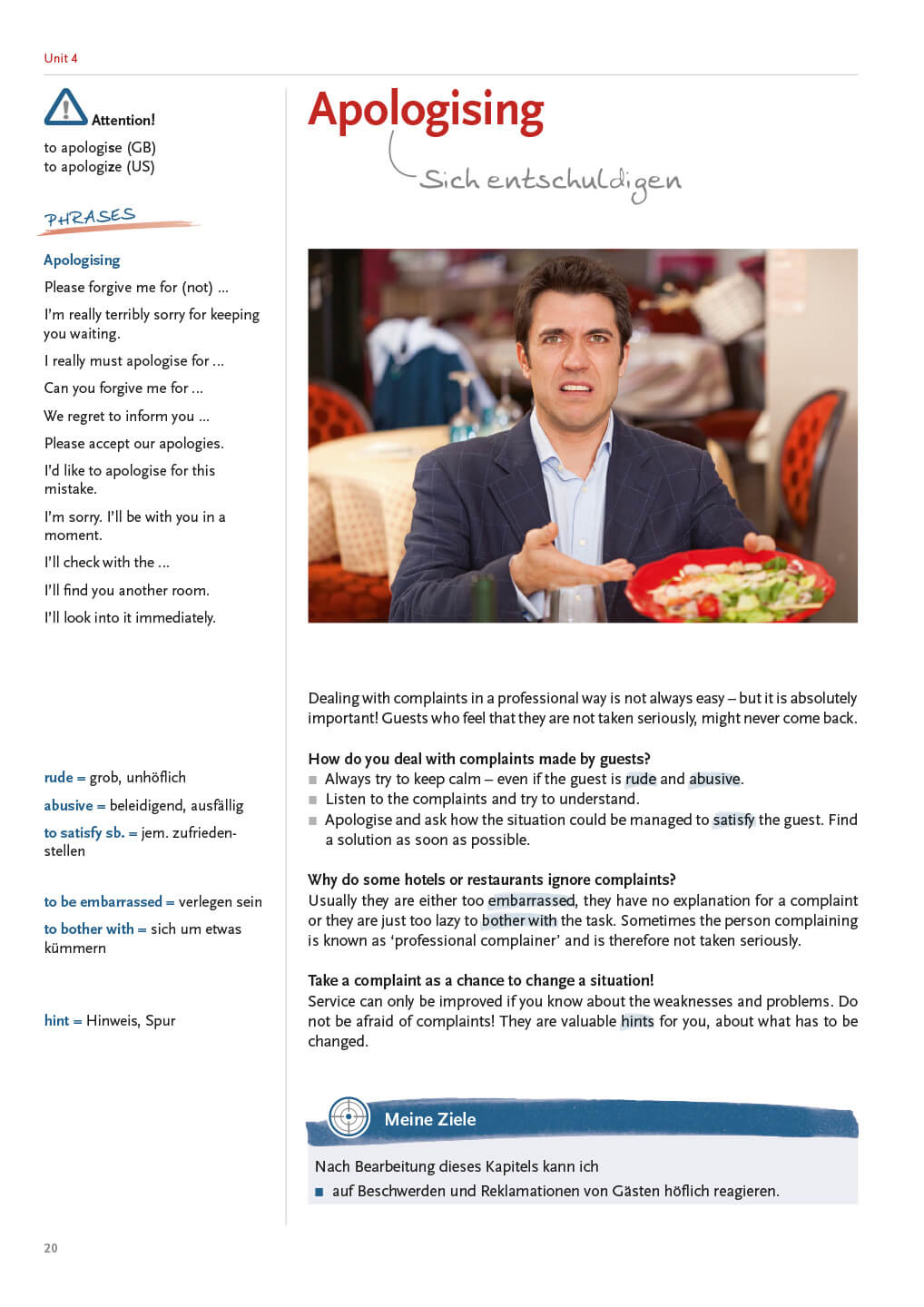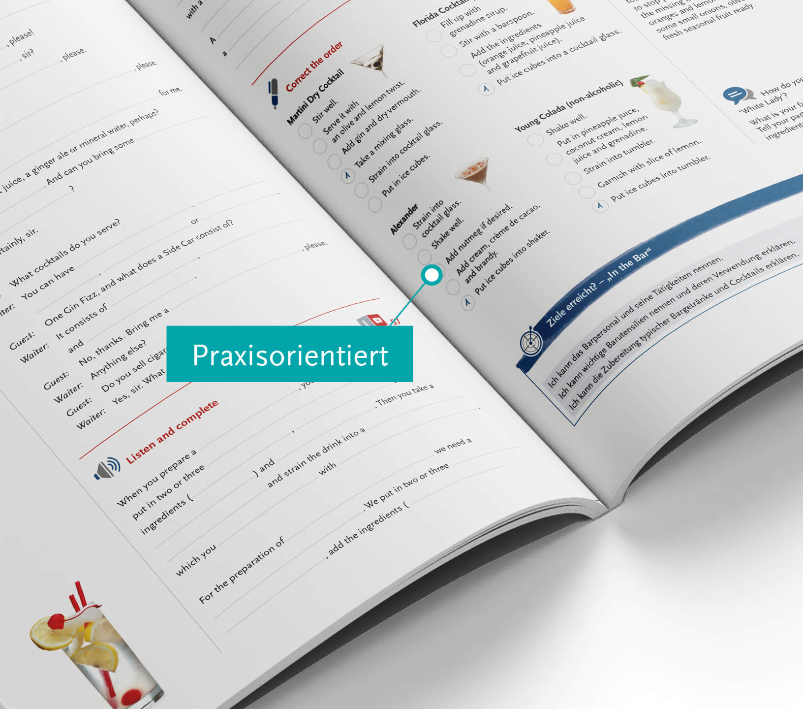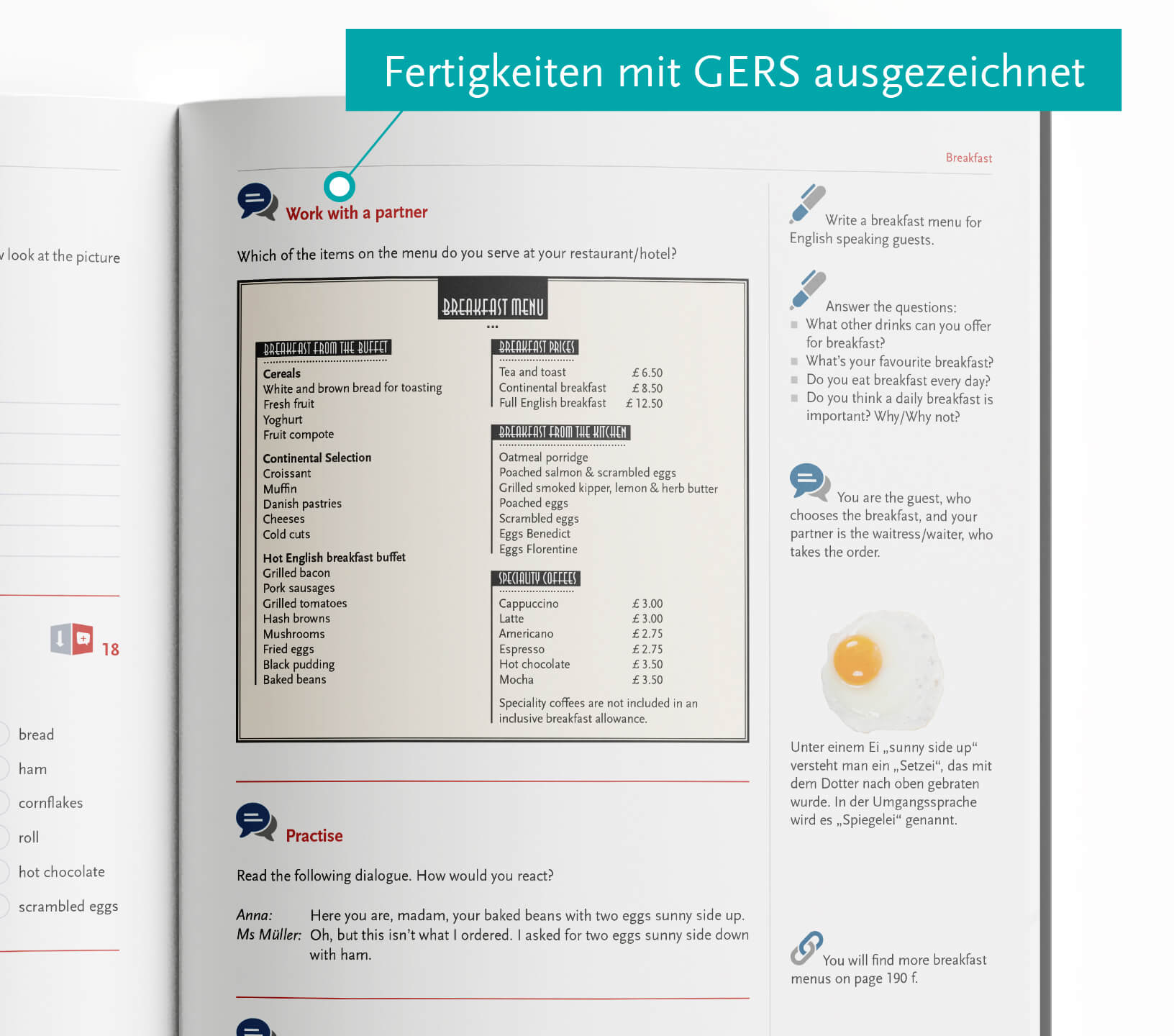 Der Fokus des Buches liegt auf kommunikativen Situationen, wie sie in der Gastronomie, dem Tourismus und der Hotellerie täglich vorkommen. Eine Vielzahl von Sprechanlässen und Übungen (auf GERS-Niveau B1) hilft beim Aufbau praxisrelevanter Kompetenzen. Damit kann man Gästen in deren Landessprache den Weg zu Sehenswürdigkeiten beschreiben und erklären, was Frikadellen oder Schupfnudeln sind.