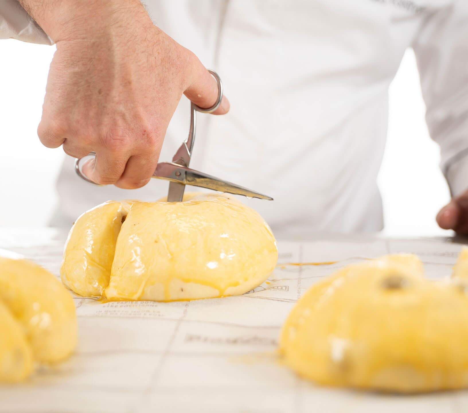 - Nochmals mit Vollei bestreichen und mit einer langen Schere dreimal symmetrisch einschneiden.