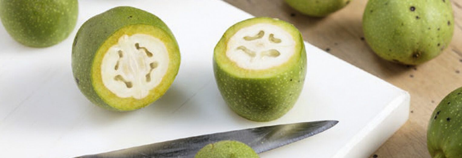 Wer einen Nussbaum in der Nähe hat, erntet jetzt ein paar grüne, unreife Nüsse in der Schale und stellt eine Köstlichkeit her – schwarze Nüsse, die im Spätherbst zu Wildgerichten, aber auch schon früher zu Desserts, als kalte Vorspeisen und zu Käseplatten gereicht werden können und eine Delikatesse darstellen!
