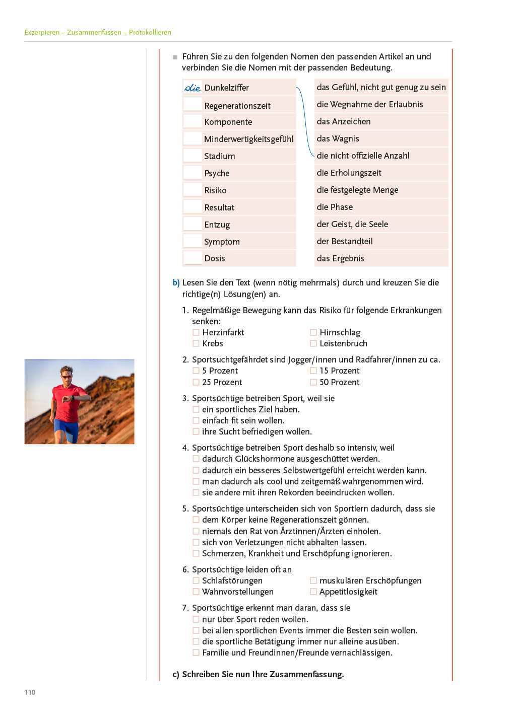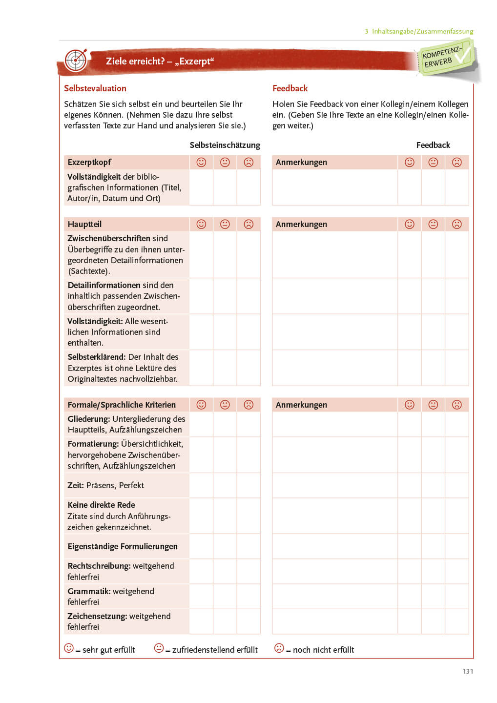 Für die Entwicklung des textsortengebundenen Schreibens wird auf BEISPIEL- und WERKZEUG-Seiten das nötige theoretische Wissen kompakt vermittelt. Die darauf folgenden Arbeitsaufgaben ermöglichen es den Schülerinnen und Schülern, anhand zuvor (kennen-)gelernter Kriterien Schritt für Schritt jene Kompetenzen zu entwickeln, die für eine gelungene Textproduktion erforderlich sind.