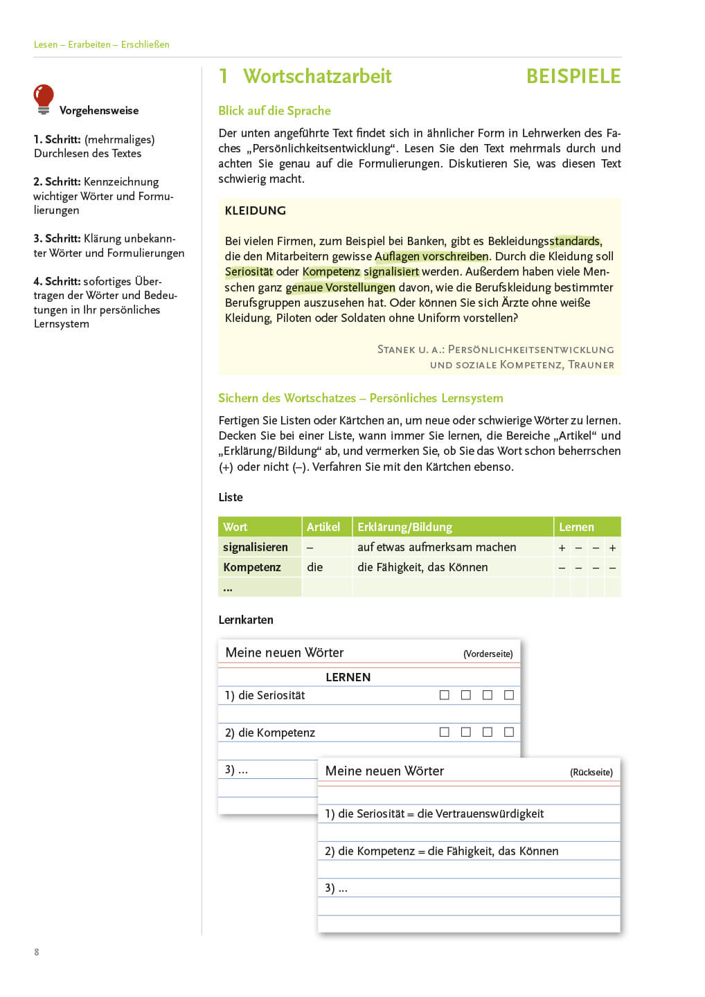 Dies hat den Vorteil, dass die Schülerinnen und Schüler am Ende ihrer Ausbildung ein Kompendium aller gelernten Inhalte besitzen, das sich optimal zum Lernen für die Abschlussprüfung eignet. Gleichzeitig werden sie dazu motiviert, selbst produzierte Texte zu hinterfragen, sie gegebenenfalls zu überarbeiten und ihr Sprachbewusstsein weiterzuentwickeln.