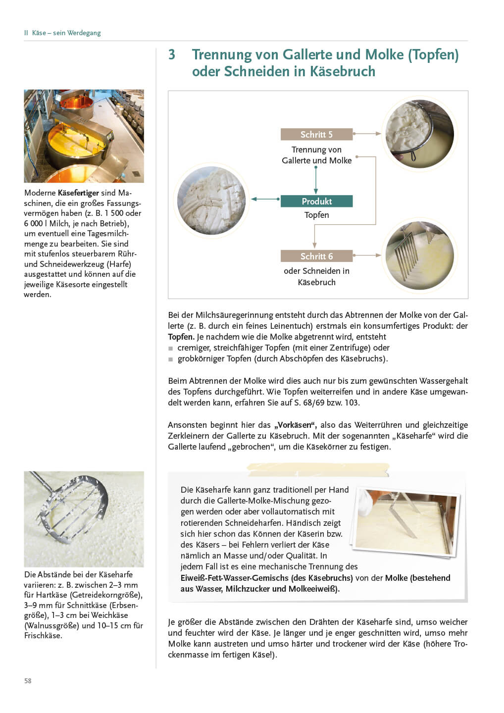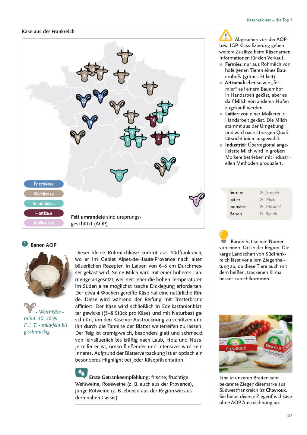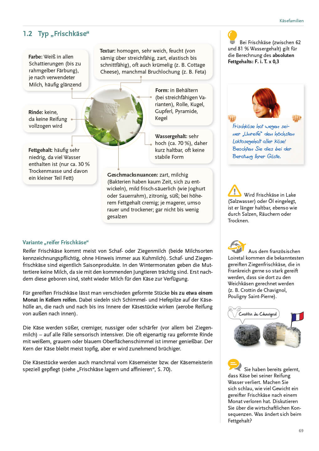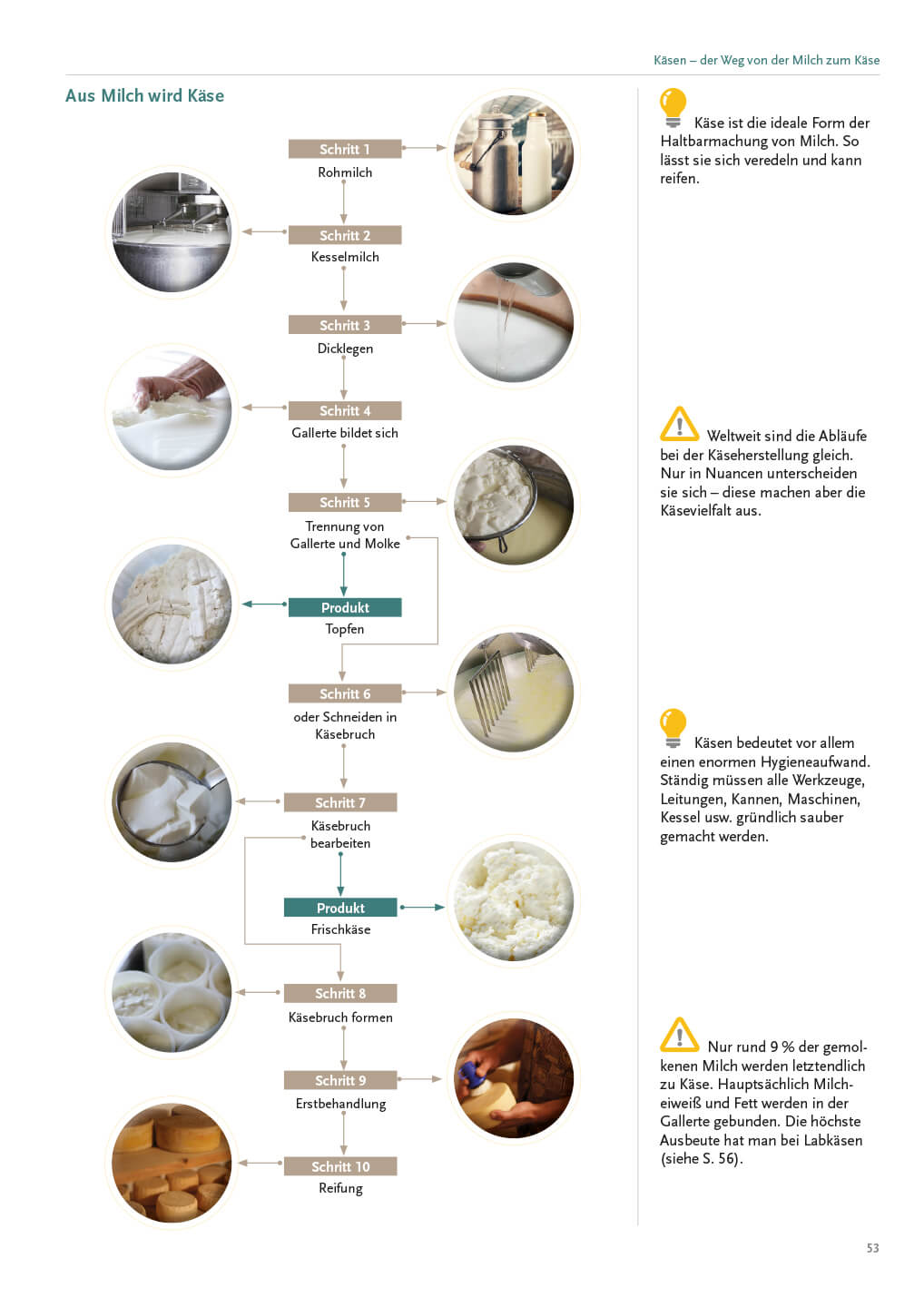Die große Käsevielfalt wird in allen Herstellungsvarianten übersichtlich und leicht verständlich präsentiert. Ebenso finden sich zu jeder Käsegattung die richtige Lagertechnik und Pflege, die geeignete Schnitttechnik, empfehlenswerte Getränke, dazu passendes Brot und Gebäck sowie harmonische Begleiter wie Chutneys, Obst oder Nüsse. So werden die Inhalte verknüpft und prägen sich leichter ein.