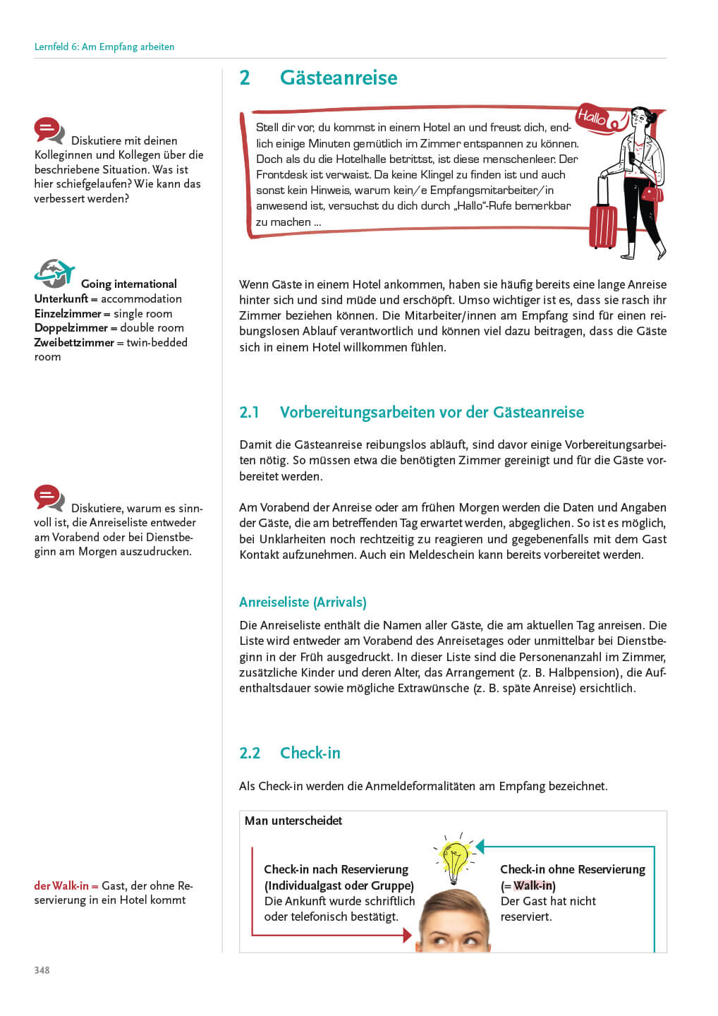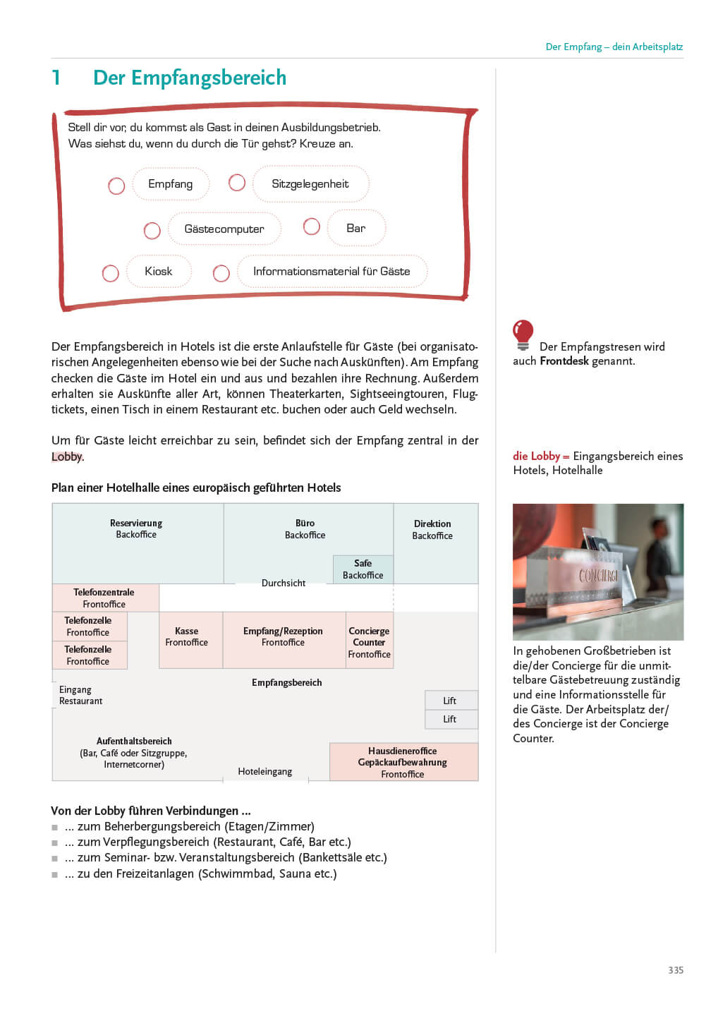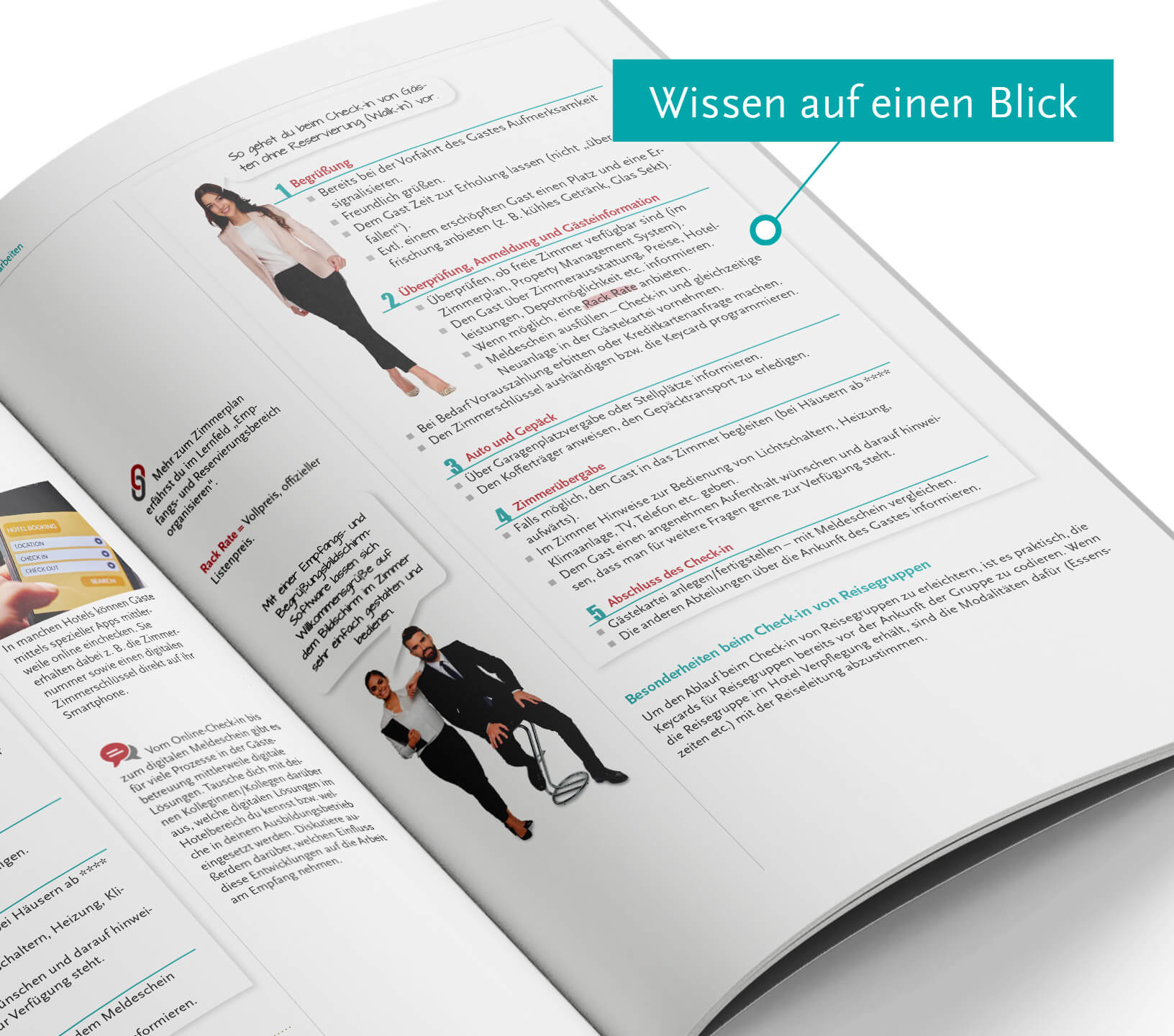 Alle wichtigen Abläufe und Aufgaben rund um die Arbeit am Empfang, z. B. Check-in und Check-out, aber auch Reklamation oder spezielle Gästewünsche werden beschrieben und schülergerecht erklärt. Zahlreiche Beispiele veranschaulichen komplexe Zusammenhänge. Geltende Rechtsvorschriften werden ebenso erläutert wie die Zusammenarbeit mit anderen Abteilungen. Da gästeorientierte Kommunikation die Basis der täglichen Arbeit am Empfang ist, liefern unsere Bücher Textbausteine und detaillierte Beispiele, wie man im Berufsalltag ziel- und adressatenorientiert kommuniziert. Praxisorientiert behandelt werden zudem Themen wie Rechnungen, Beschwerdemanagement oder Marketing.