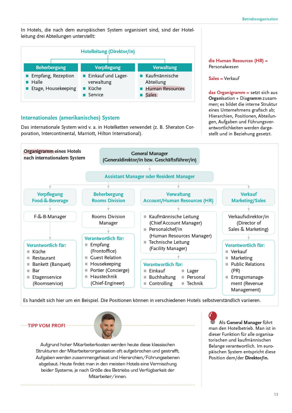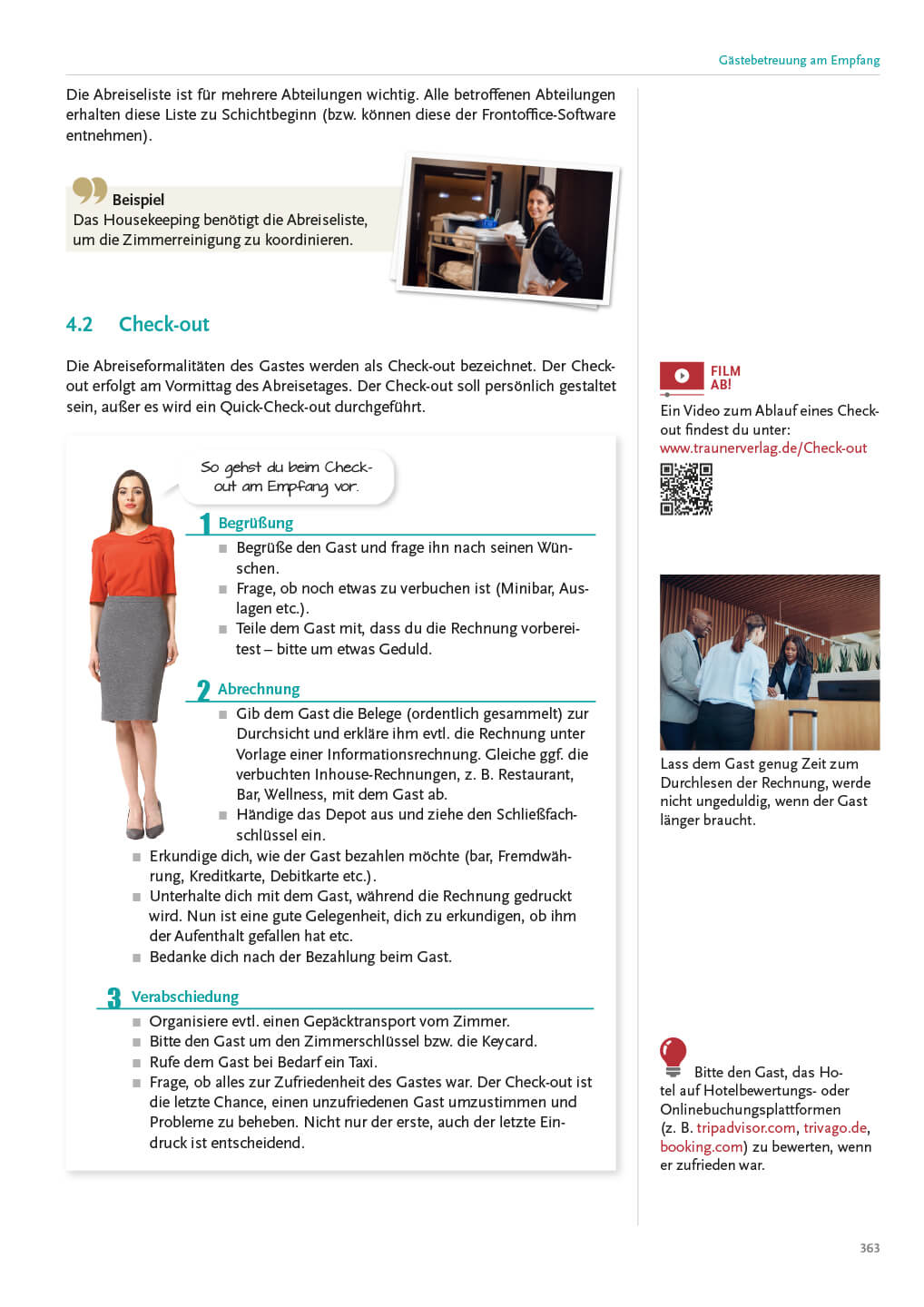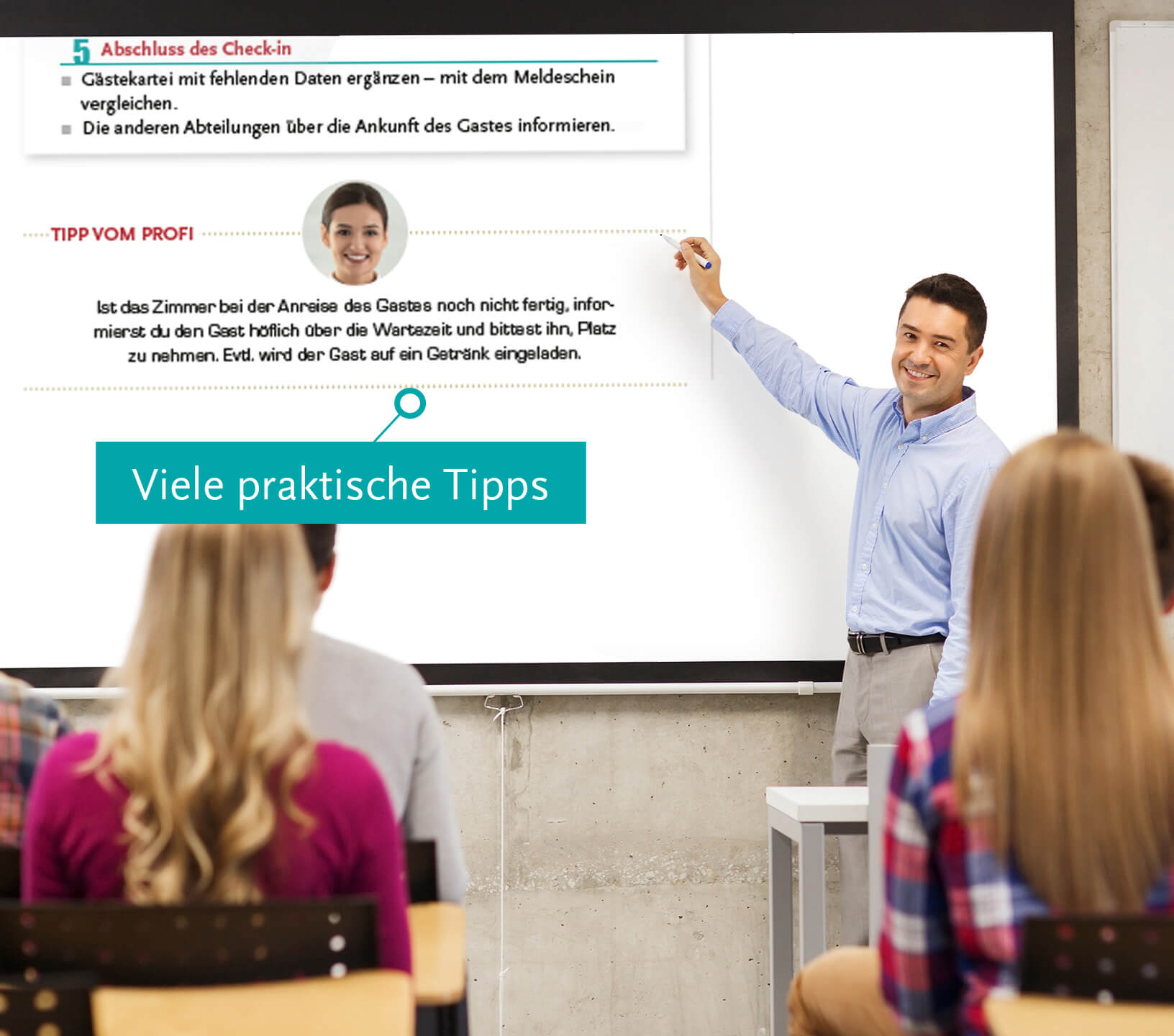 Alle wichtigen Abläufe und Aufgaben rund um die Arbeit am Empfang, z. B. Check-in und Check-out, aber auch Reklamation oder spezielle Gästewünsche werden beschrieben und schülergerecht erklärt. Zahlreiche Beispiele veranschaulichen komplexe Zusammenhänge. Geltende Rechtsvorschriften werden ebenso erläutert wie die Zusammenarbeit mit anderen Abteilungen. Da gästeorientierte Kommunikation die Basis der täglichen Arbeit am Empfang ist, liefern unsere Bücher Textbausteine und detaillierte Beispiele, wie man im Berufsalltag ziel- und adressatenorientiert kommuniziert. Praxisorientiert behandelt werden zudem Themen wie Rechnungen, Beschwerdemanagement oder Marketing.