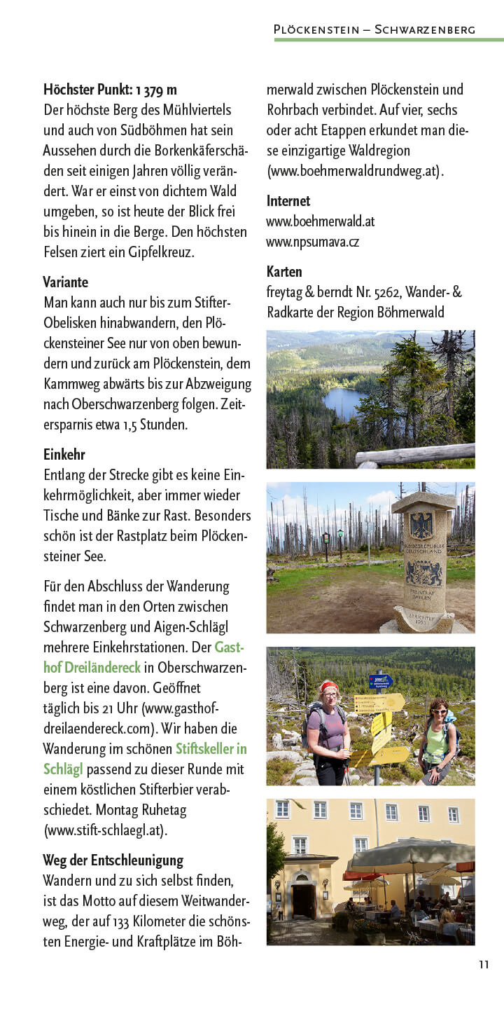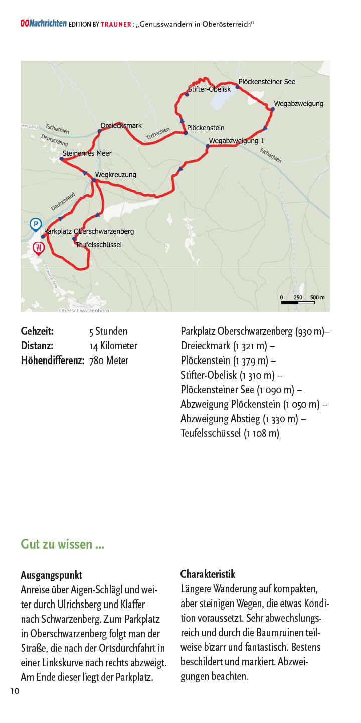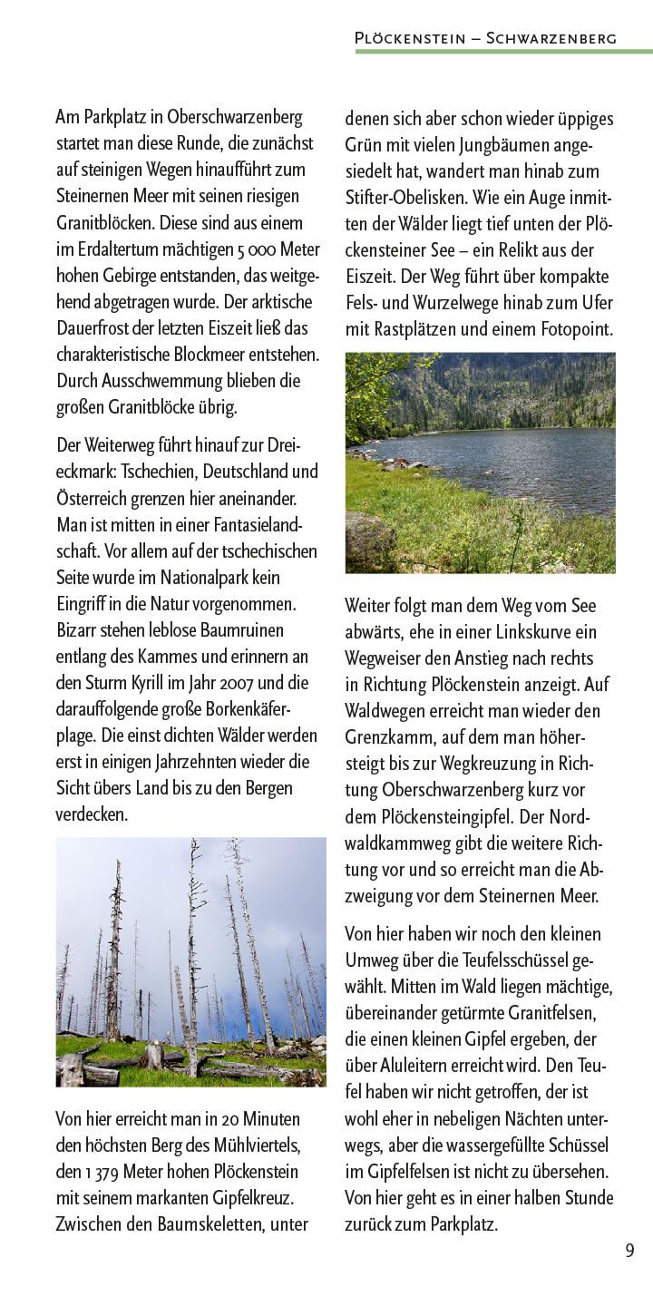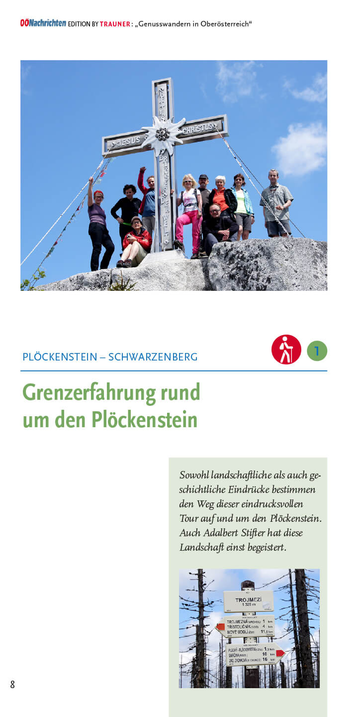 Touren im Wanderführer: Plöckenstein (Schwarzenberg), Sternstein (Bad Leonfelden), Pferdeeisenbahnwanderweg (Summerau), Lebensblickeweg (Sarleinsbach), Granitlandwege (Altenfelden/Neufelden), Bergkräuterweg (Hirschbach), Buchberg und Braunberg (Lasberg), Feldaisttal (Kefermarkt), Pilgern am Johannesweg (Mühlviertler Alm), Haugsteinrunde (Engelhartszell), Vierviertelblickrunde (Waldkirchen), Hoch über der Donau (Hofkirchen), „Es mueß seyn“-Weg (St. Agatha), Panoramaweg Süd (Peuerbach), Mayrhofberg und Schaunburg (Strohheim), Pesenbachtal (Bad Mühllacken), Kirschblütenweg (Scharten), Bauern- und Holzknechtrunde (Wilhering), Über alle Berge, 1. bis 3. Etappe (Linz), Stadtwanderweg Nr. 7 (Linz), Wolfsschlucht (Bad Kreuzen/Grein), Granatzweg (Geiersberg/Pram), Bewegungsarena (Waldzell), Kolomansberg (Thalgau/Mondsee), Hongar und Gmundnerberg (Altmünster), Langbathsee und Windlegern (Ebensee/Neukirchen bei Altmünster), Grünberg und Laudachsee (Gmunden), Almuferweg (Vorchdorf/Grünau), Almenwanderung Spitzplaneck (Grünau), Hirschwaldstein (Micheldorf), Rinnende Mauer (Molln), Frühling auf der Anlaufalm (Großraming), Feuerkogelrunde (Ebensee), Gleinkersee und Dümlerhütte (Windischgarsten), Schneiderberg (Grünau), Hoisenradalm (Bad Ischl), Entlang der Traun (Obertraun), Wege unterm Dachstein (Obertraun)