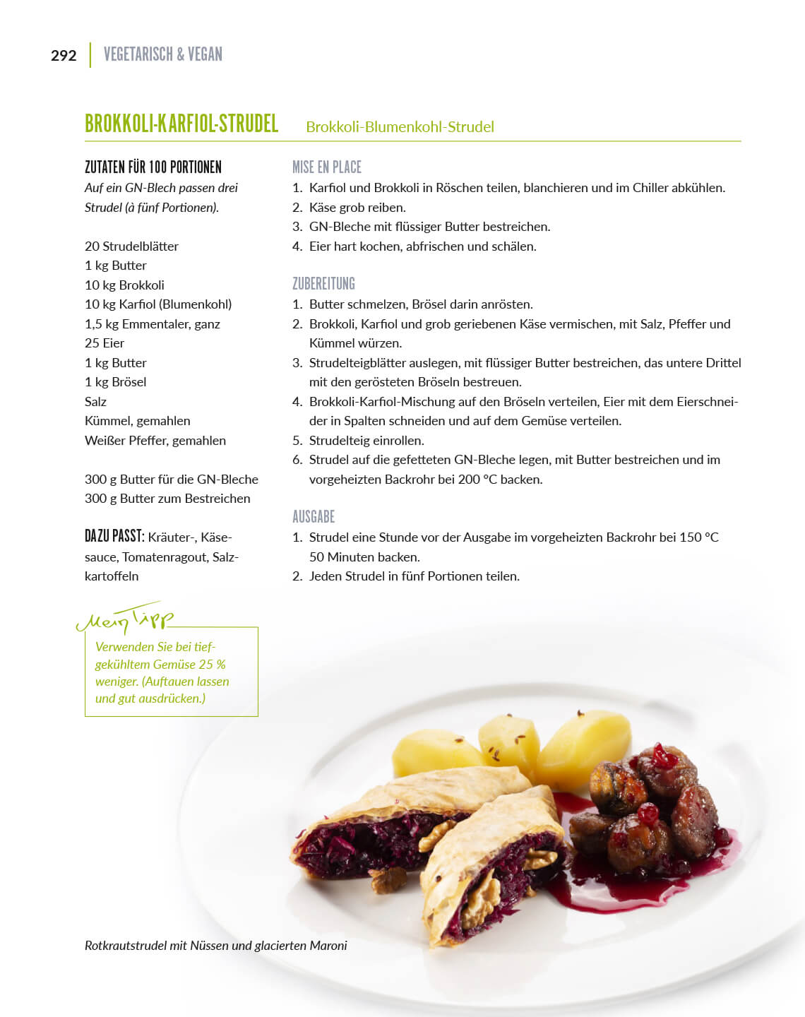 Mit über 500 Rezepten von Peter Kirischitz, Helmut Österreicher, Siegfried Kröpfl, Robert Wanko, Johann Reisinger und vielen mehr ist eine abwechslungsreiche Menüplanung garantiert. Besonderes Augenmerk liegt auf vegetarischen und veganen Gerichten. Diese sind nicht nur stark im Trend, sondern schonen auch das Budget des Betriebes.