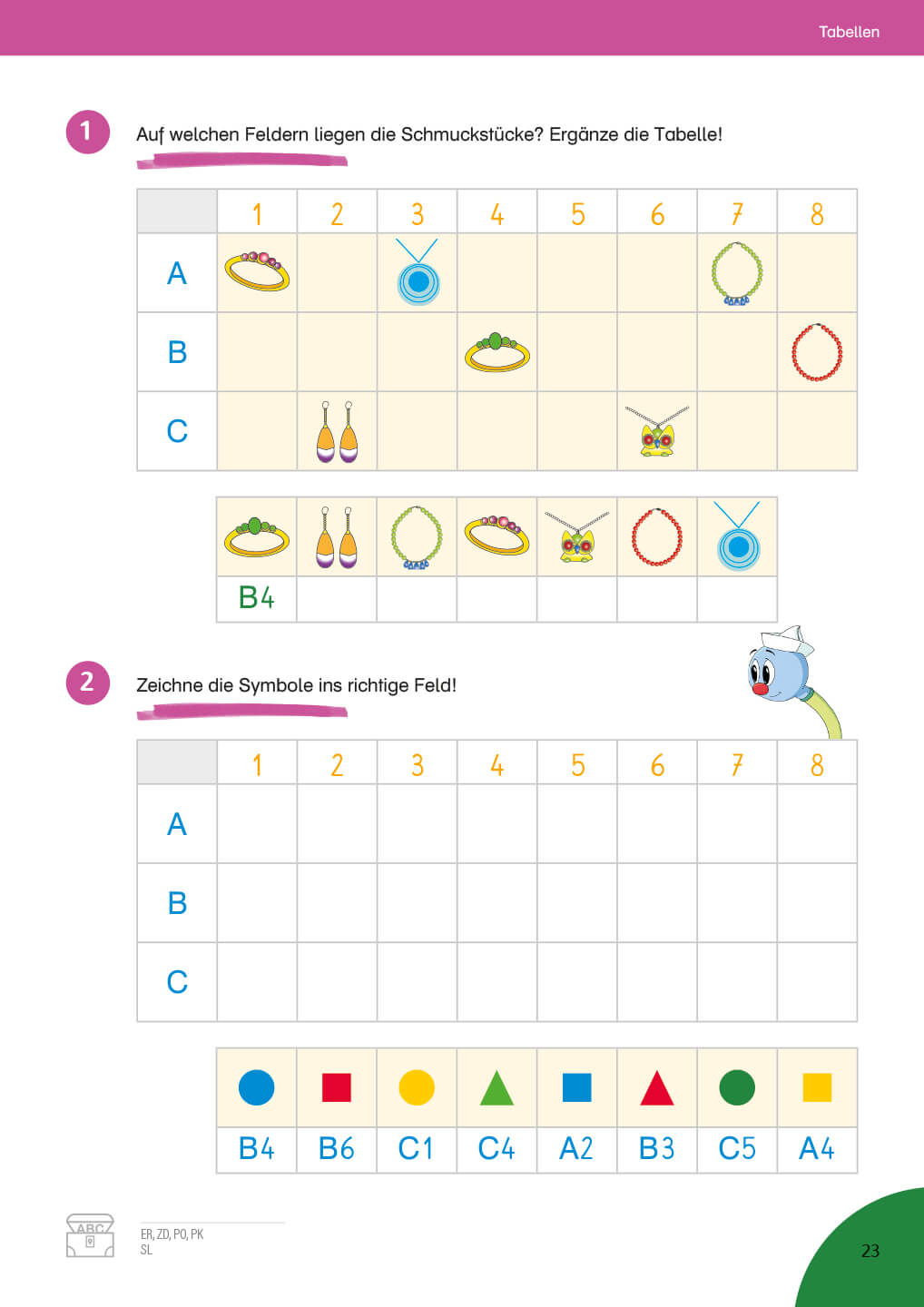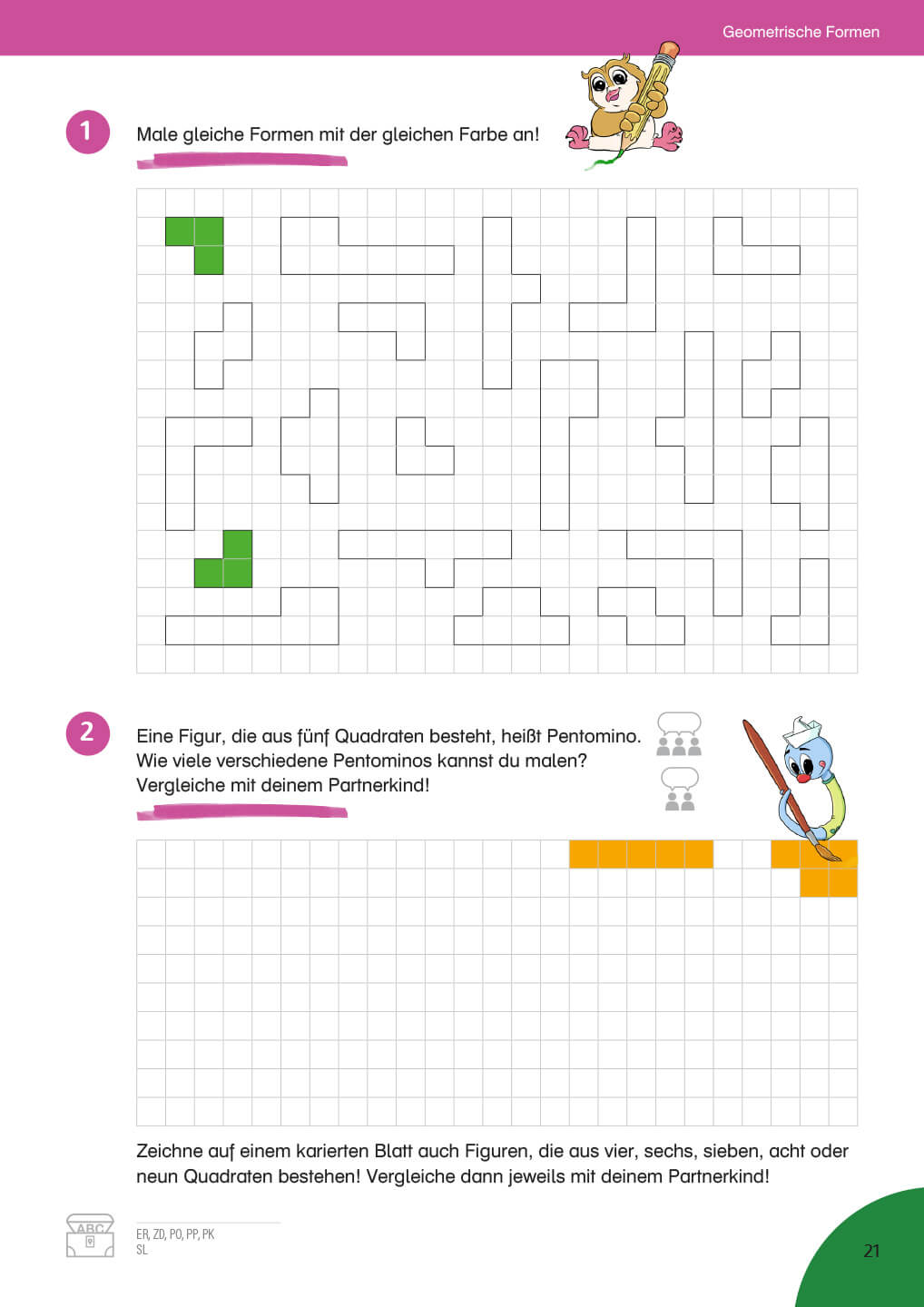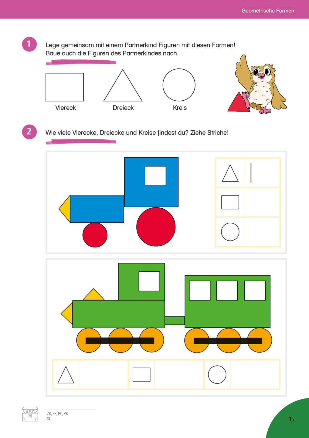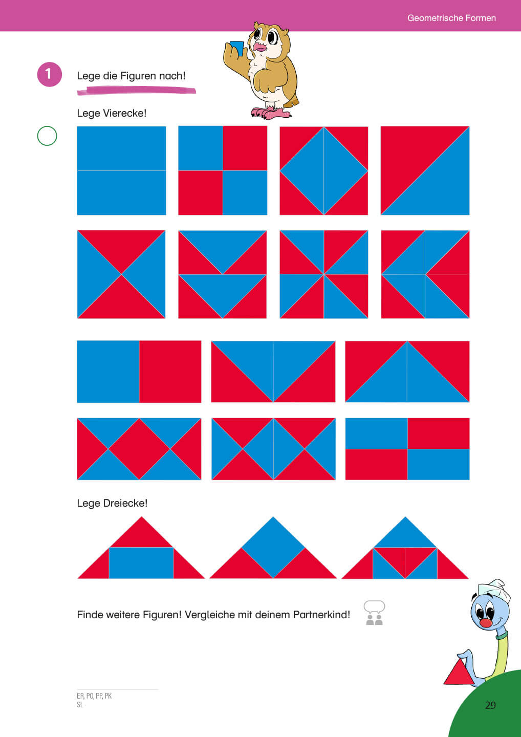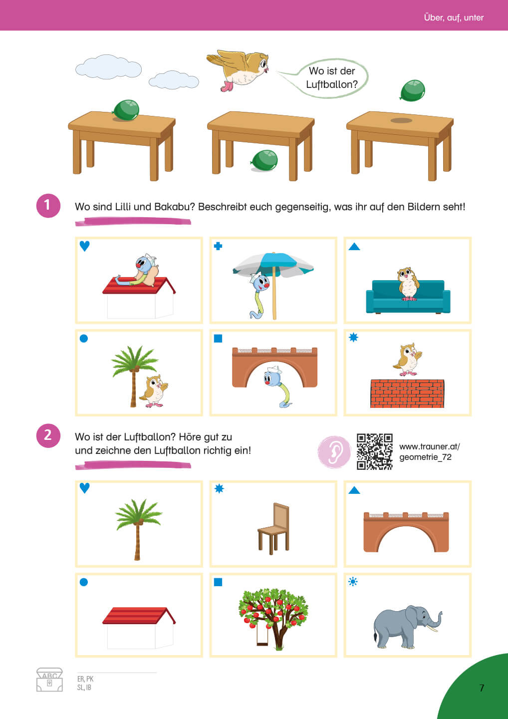 Die Schüler/innen lernen Begriffe wie rechts, links, oben unten, aber auch erste geometrische Formen wie Kreis, Dreieck und Viereck kennen
