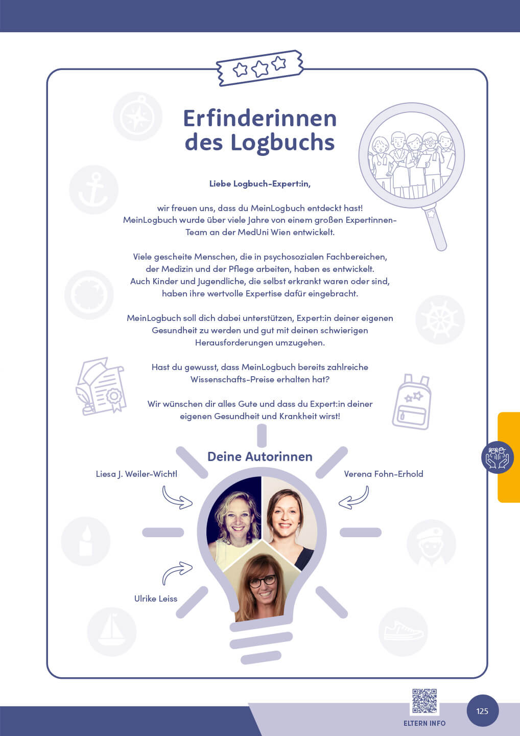 Die Herausgeberinnen sind erfahrene Klinische und Gesundheitspsychologinnen mit Spezialisierung in Klinischer Neuropsychologie bzw. Kinder- Jugend- und Familienpsychologie und pädiatrischer Psychologie. Sie arbeiten wissenschaftlich und verfügen über langjährige praktische Erfahrung in der Arbeit mit Kindern, Jugendlichen und deren Familien. Das Projekt „MeinLogbuch“ wurde bereits mit zahlreichen Wissenschaftspreisen ausgezeichnet, darunter der Occursus-Anerkennungs- und Förderpreis für Kommunikation in der Onkologie der OeGHO (2017), der Kindness For Kids-Versorgungspreis der Stiftung für Kinder mit seltenen Erkrankungen (2019) und der Titel „Inventor of the Year 2023“ der MedUni Wien.