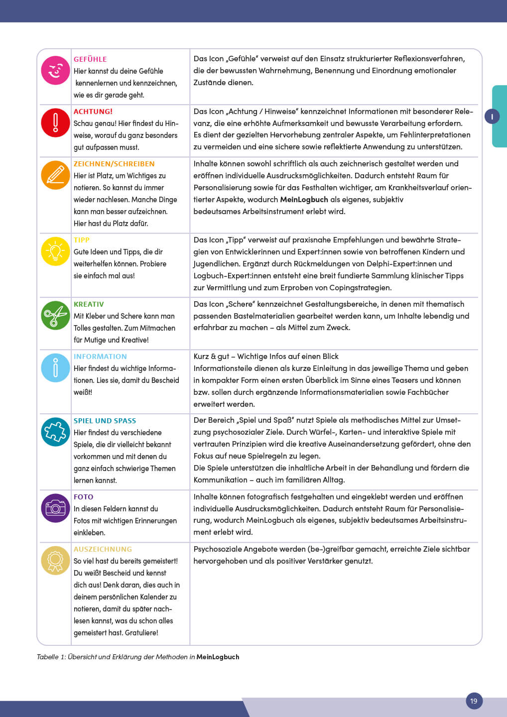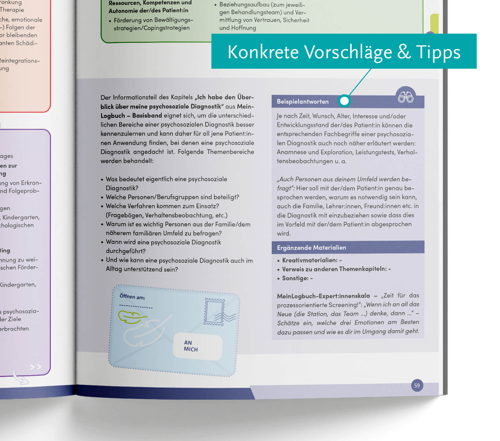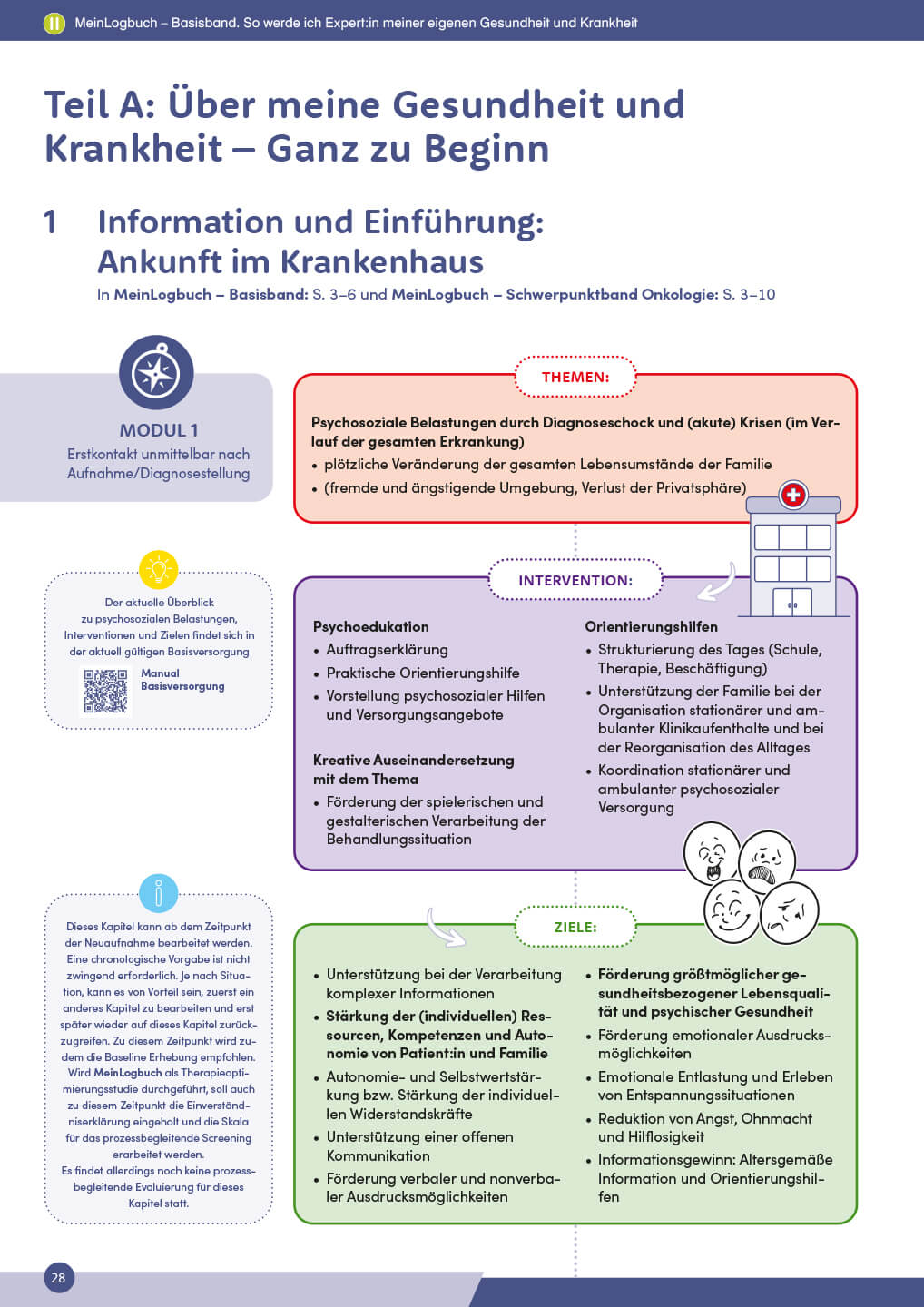 Das zu MeinLogbuch gehörende Handbuch für psychosoziale Fachkräfte bietet eine praxisnahe Anleitung zur Anwendung der Materialien im klinischen und psychosozialen Kontext. Es vermittelt fundiertes Hintergrundwissen, methodische Erläuterungen sowie konkrete Hinweise zur Planung, Durchführung und Evaluation von Interventionen in der Pädiatrie. Ergänzt durch Fallbeispiele, Lösungshilfen und Arbeitsmaterialien unterstützt es Fachpersonen dabei, Kinder und Jugendliche strukturiert zu begleiten, ihre Gesundheitskompetenz zu stärken und individuelle Ressourcen im Umgang mit der Erkrankung sichtbar zu machen. Auf diese Weise leistet es einen nachhaltigen Beitrag zur Verbesserung der psychosozialen Versorgung und damit zur Förderung der psychosozialen Gesundheit von schwer oder chronisch erkrankten jungen Patient:innen.