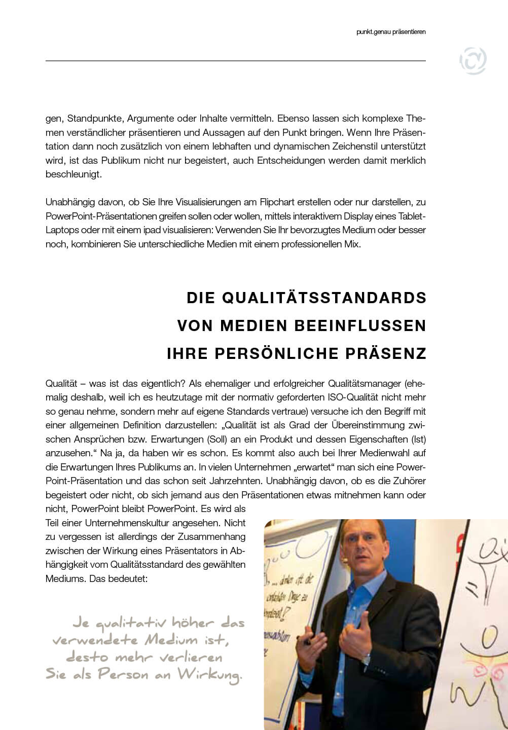 Eine Reduktion von Inhalten erfordert Wissen. Nur wer komplexe Systeme kennt, kann auch das Wesentliche erfassen und auf den Punkt bringen. Mit punkt.genauen Visualisierungen erreichen Sie zudem eine hohe Effizienz und Nachhaltigkeit Ihrer Präsentation. Finden Sie dazu das Neueste zu Flipchart, PowerPoint, Tablet und iPad. Unterstreichen Sie Ihre Inhalte mittels Wirksprache. Sie verbinden damit Wort und Bild, erreichen eine hohe Aufmerksamkeit, überzeugen und können Handlungen bewirken.