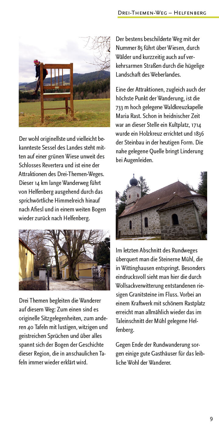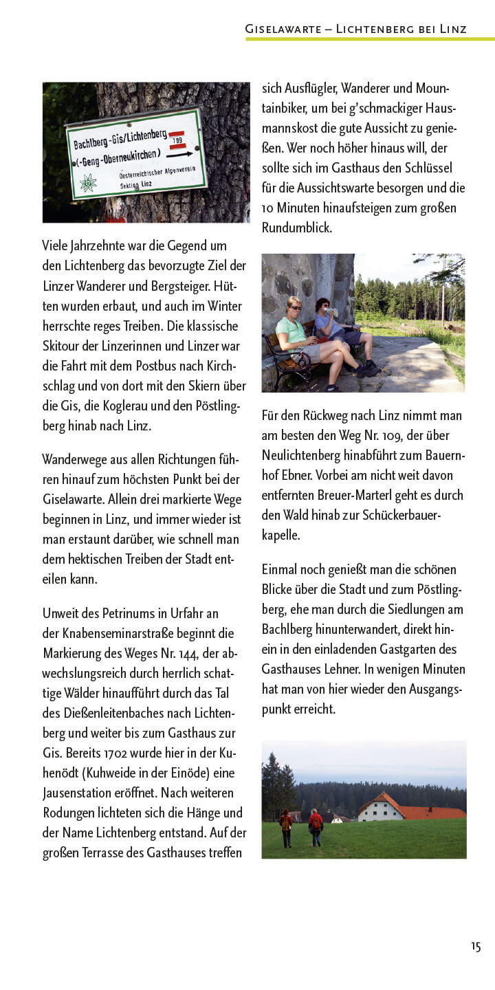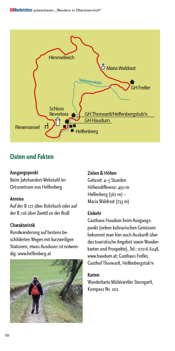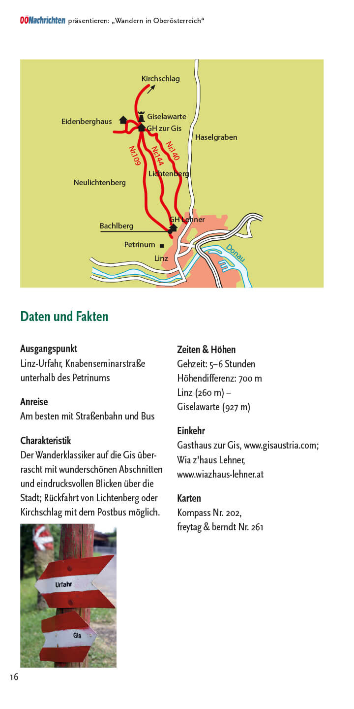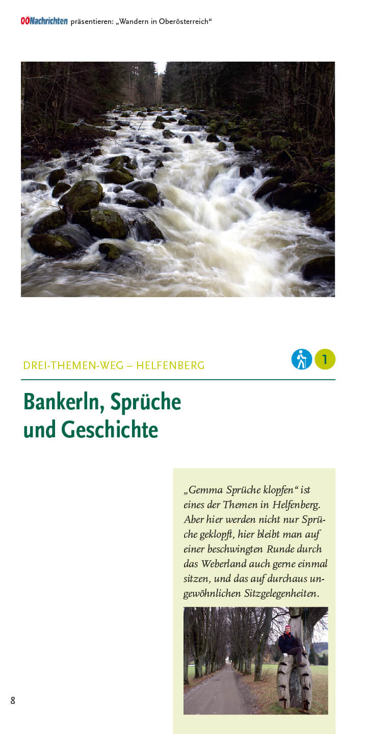Routen im Wanderführer: Drei-Themen-Weg (Helfenberg), Braunberg (St. Oswald bei Freistadt), Giselawarte (Lichtenberg bei Linz), Stamperlweg (Ottensheim), Pfenningberg (Steyregg), Stillensteinklamm (Grein), Tal der 7 Mühlen (Peuerbach), Prinzensteig (Wilhering), Kruckenbrettl (Grünburg), Schieferstein (Losenstein), Hochsalm (Steinbach am Ziehberg), Bodenwies (Kleinreifling), Hoher Nock (Windischgarsten), Leitersteig (Windischgarsten), Wasserklotz (Rosenau), Almenweg (Rosenau), Seespitz (Windischgarsten), Höss-Alpin-Runde (Hinterstoder), Warscheneck (Spital am Pyhrn), Drei-Hütten-Runde (Spital am Pyhrn), Traunstein (Gmunden), Hochsteinalm (Traunkirchen), Großer Sonnstein (Ebensee), Brennerriesensteig (Steinbach am Attersee), Der Weg aus der Kreh (Ebensee), Eibenberg (Ebensee), Kaiserweg (Ebensee), Purtschellerweg (St. Wolfgang), Hohe Schrott (Bad Ischl), Jainzen (Bad Ischl), Naglsteig (Bad Ischl), Katergebirge (Bad Ischl), Ewige Wand (Bad Goisern), Sandling (Altaussee), Sarstein (Bad Goisern), Hallstätter-See-Runde (Hallstatt), Gosau (Hallstatt (Gosau), Heilbronner Weg (Hallstatt), Trägerweg (Hallstatt), Hoher Dachstein (Gosau)